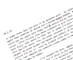 It seems these days the bath is my epiphany post – my under-the-apple tree location of choice for a eureka-esque moment. Which is a bitch cos the paper gets soggy really easily and my skin starts to prune – after writing nine pages longhand on plot alterations and back story, that water is COLD. But it seems I’m able to think in this zen-like space, like the water releases an inner creative geyser, my pores accept the warmth and comfort of the womb-like posture I’m sat in – plus my stomach looks flat. And this in a hip bath! Just imagine the creative riches ready to be plumbed when the double-ender is ready!